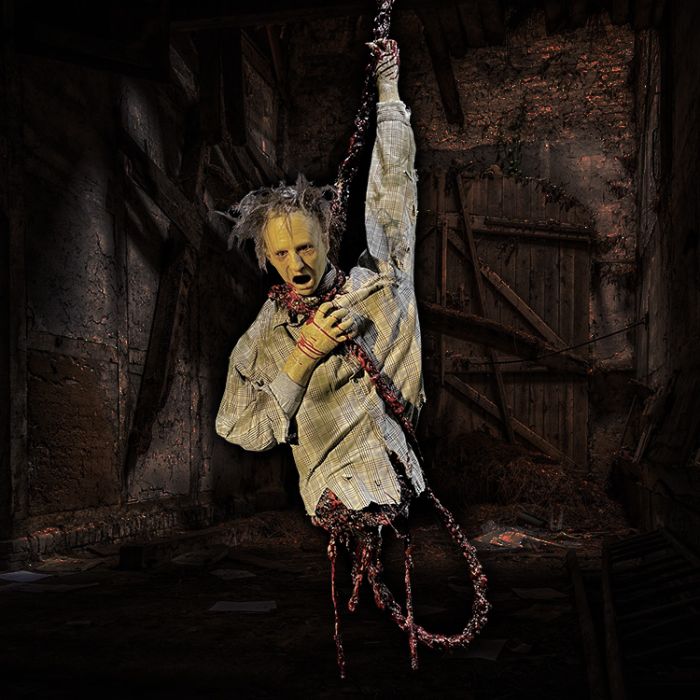 Bloody torso hangs from a noose made from his own intestines! Thrashes violently while trying to lift himself up.