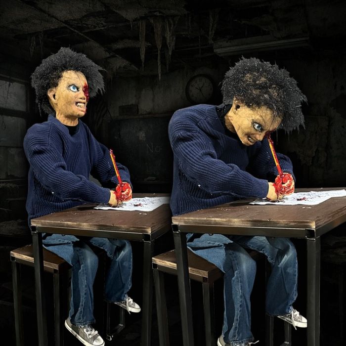 Insane kid sits at a desk then suddenly slams his face down impaling his eye on a bloody pencil! Super disturbing.