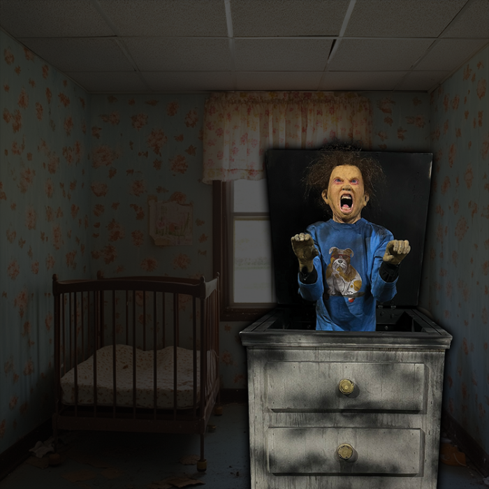 Plug & Play! All of our pneumatic (air powered) props come complete and ready to run with programmed controller, motion sensor, intense audio, and speakers. Comes complete installed into dresser. Foot print: Cabinet 24″x24″x36″ tall.