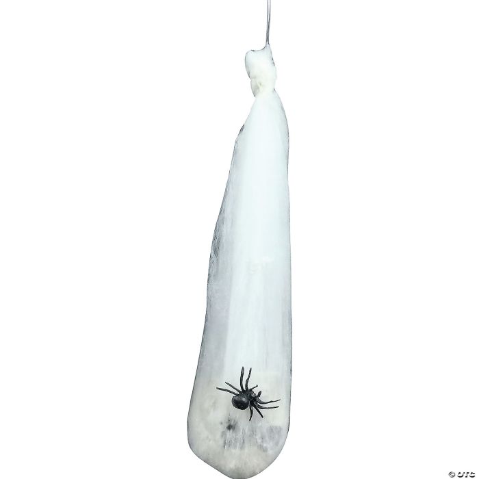 A foot long silky spider sac filled with a human skull guarded by a small plastic spider. This is an essential addition for any spider web set-up and Halloween home decoration. Easily hang most anywhere using webbing at the top of the sack to blend into existing spider web decorations. The larva skull can also be suspended from large spider decorations adding an extra real effect.