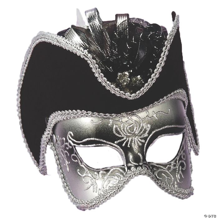Silver venetian mask with black hat attached.