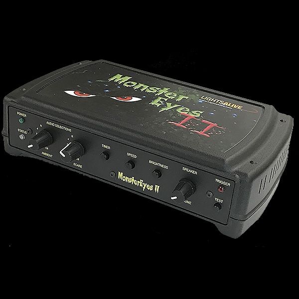 We’ve lit the afterburners on this one! Not only does it do the 16-channel lights-in-the-dark effect of the original, but we’ve added audio! There’s a selection of background and scare sounds, a built-in amplifier so you can connect speakers, and if that’s not loud enough, there’s a line out jack to connect to your sound system. Controls include speed, brightness, speaker volume, and timer. Yes, there’s an internal timer to let MonsterEyes II run independently if you don’t want to trigger the effect. And you can use a variety of LED’s – up to 1/2 watt per channel. Or purchase MonsterEyes bundled with Eyeball and iSocket boards, ready to plug and play!