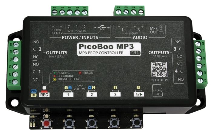 The PicoBoo MP3 has two trigger inputs. The second input can be used to trigger an alternate scene, or as a stop or reset button. Both inputs can be set to single-shot mode, which prevents looping if the trigger is kept on. This is handy if a beam sensor goes out of alignment. They can also be set to a Run Once mode. This makes sure they can only run their scene once until the other input is triggered. This is really handy for Escape Rooms that want the scene to run only once until a reset button is pressed.