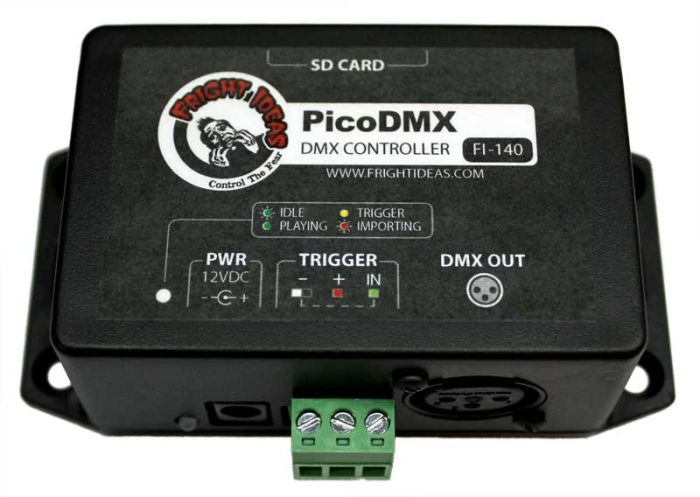 Ever need to incorporate a DMX device into a scene or scare but couldn’t justify the complexity and cost of a full-featured DMX controller? The PicoDMX allows you to control most DMX fixtures from a simple trigger or PicoBoo controller. A maximum of 32 DMX channels is supported.