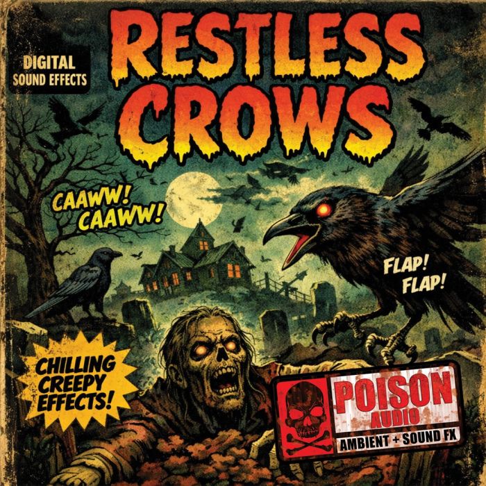 2 Tracks 1. 63 minutes Irritated field of crows caw, squawk and flap wings causing an uneasy environment. 2. :38 CROWS ATTACK: Mass of birds flap wings, caw and squawk violently.