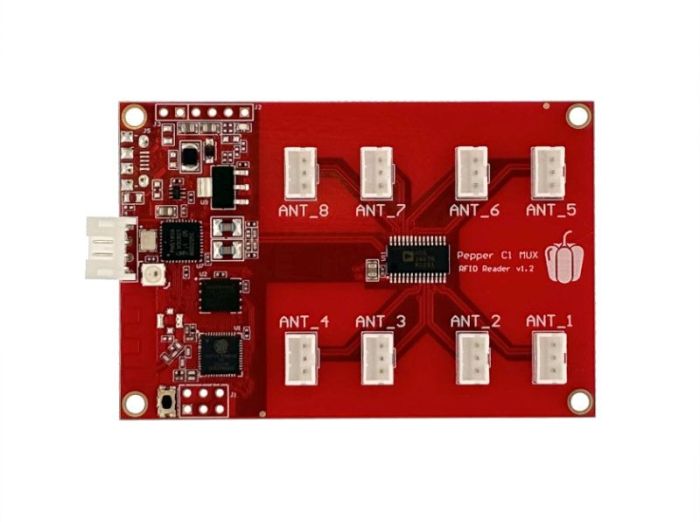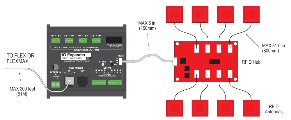 The RFID board supports up to 8 RFID antennas. It must be connected to an IO Expander, which is itself connected to a Flex with DMX or any FlexMax.