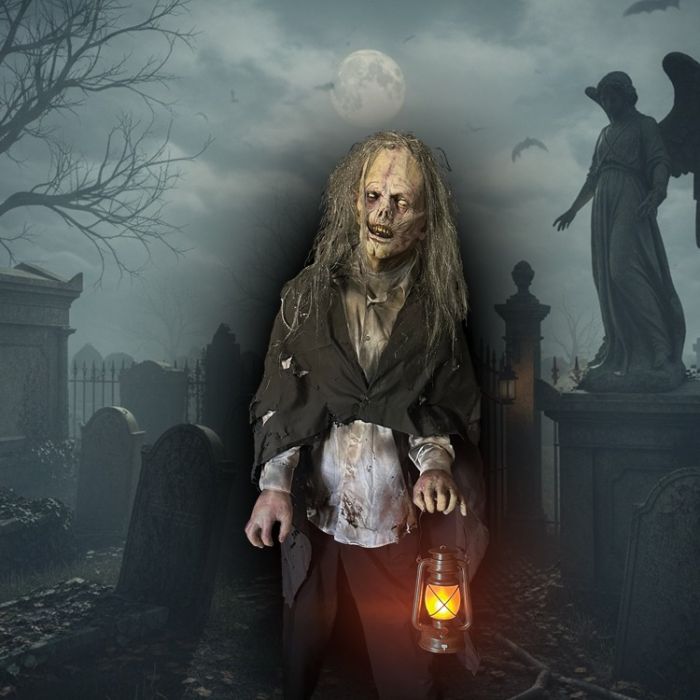 Janet turns in slow creepy zombie like circle while holding lantern. Great addition for any Graveyard!