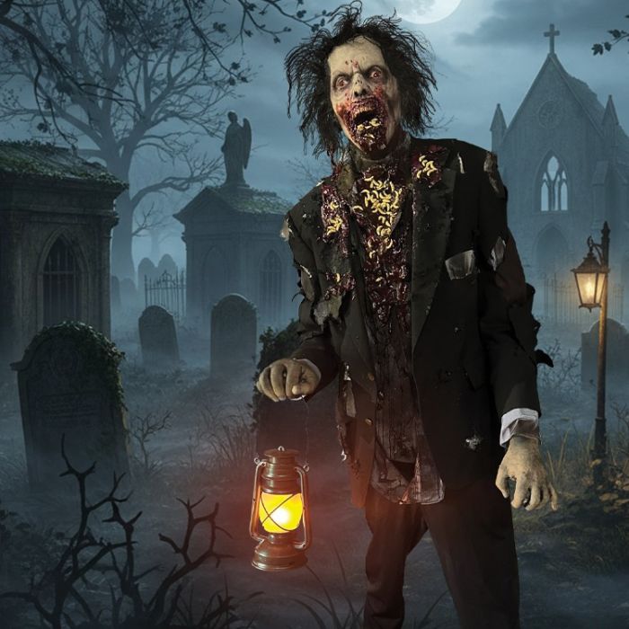 Maggot Zombie turns in slow creepy zombie like circle while holding lantern. Beautifully detailed prop.