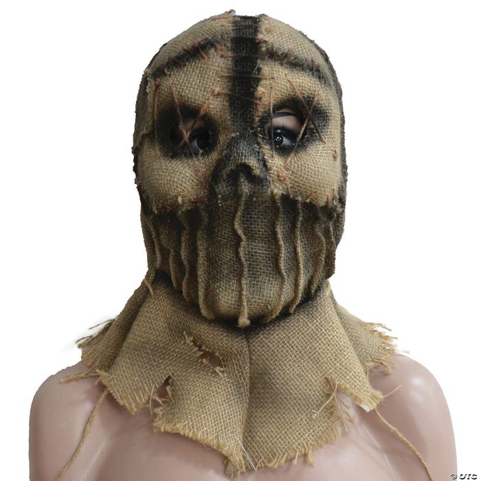 The Scarecrow Mask 12 full-face mask covers the entire head and neck. The molded design has the look of aged burlap, wrinkling? around the eyes and mouth. It also has a molded red rope around the neck. The mask also has dark eyes and a bump that hints at