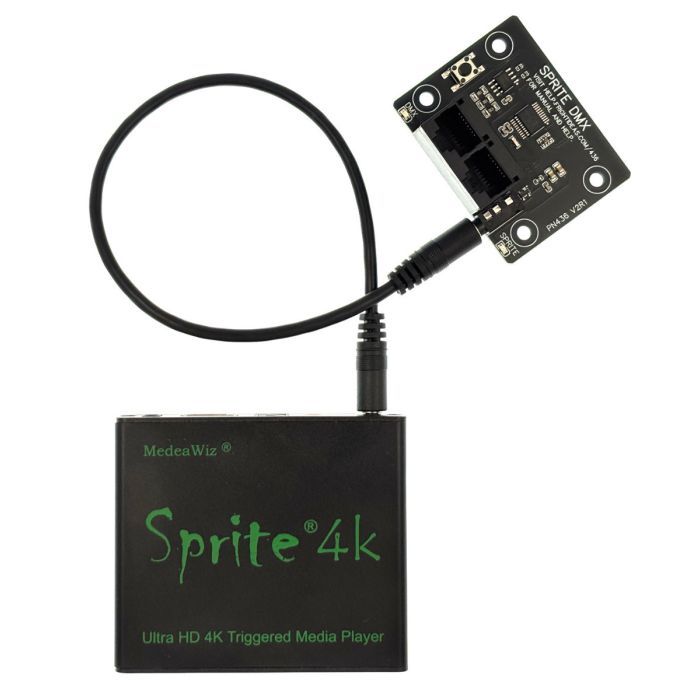 Trigger up to 200 separate videos and control playback and volume via DMX. Using DMX to interface to the player frees up precious outputs on the controller and allows the Sprite player to be located hundreds of feet away from the main controller.