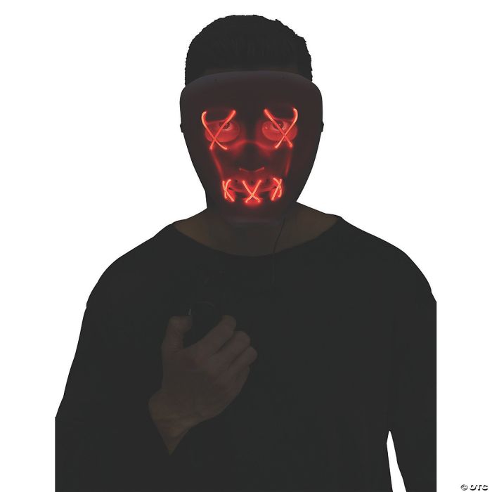 A totally new effect which is revolutionizing masks! You get a mask with string that crosses the eyes and makes the mouth look like it is sewn shut but thanks to 2 AA batteries when you get in the dark the string lights up adding a eerie glow to the mask unlike anything youve seen before. One mask. Batteries are included. Light Up EL String. Adult Size PVC Mask with Battery Pack.