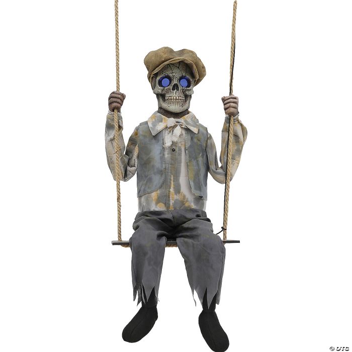Everyone will be afraid to come up to your house with the Swinging Skeletal Boy around! This creepy prop features a Victorian-era skeletal boy with hollowed out eyes that glow an other-worldly blue and speaks haunting phrases to all passersby as his head turns side-to-side while he swings back and forth on his swing. Your haunted house will never be the same with the Swinging Skeletal Boy! Animation: Eyes glow blue Head turns side-to-side Swings back and forth on swing. Phrases prop says: inchesHello. Do you want to play? Ive been swinging here waiting for you, for years and years. You have such nice skin...can I have it? (giggle) Thats okay, Ill come get it when youre sleeping. Ill make you one of us, then you can swing forever too (giggle)! inches, inchesOne, two, Im a you, Three, four, breaking down your door, Five, six, beware of my tricks, Seven, eight, you will not escape, Nine, ten, this will never end! (Giggle) inches. Activation options: Steady-on, Infra-red sensor (works up to 6.5 feet away and works in all lighting conditions), Step-here pad (included). Power: UL power adapter that plugs into any standard outlet. Materials: Polyester, PVC, sponge, plastic, hemp rope, electronics. Assembly required. Fixed height 62 inches, width 16 inches, animation right to 50 inches, depth 18 inches