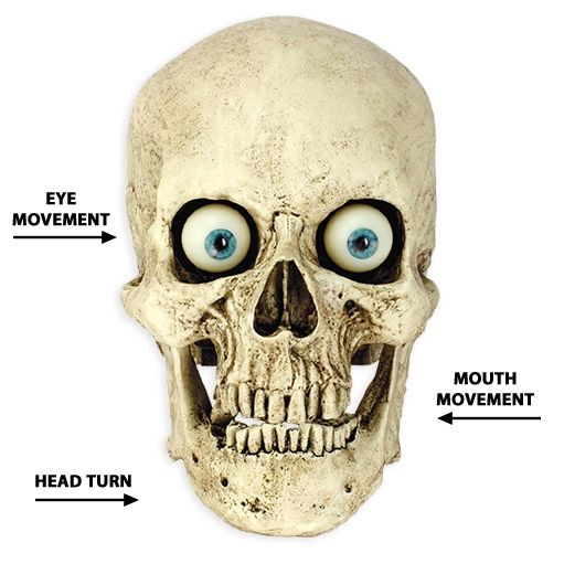 Includes Skull with mouth, eye and head turn movement servo motors and PicoTalk controller inside the skull. All you need is an audio source (such as a CD player, MP3 player such as our BooTunes, microphone, etc) and speakers. The Talking Skull will react to whatever audio you send it, no programming required!