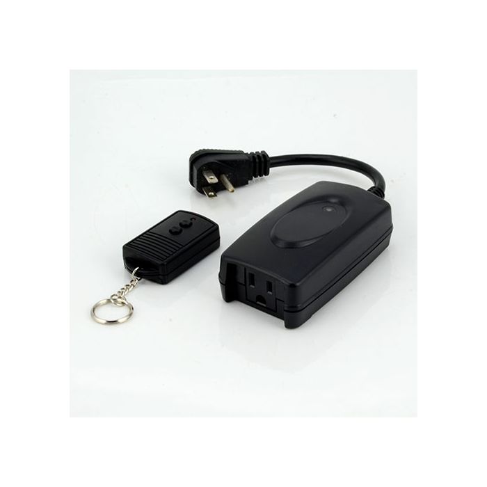 A wireless remote with two buttons and base station with an AC socket that can handle up to 8Amps total.